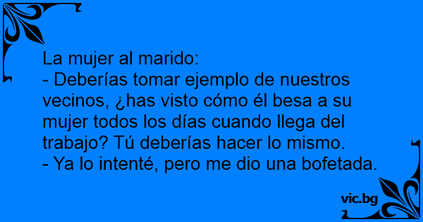 - Deberías tomar ejemplo de nuestros vecinos, ¿has visto cómo él besa a su mujer todos los días cuando llega del trabajo? Tú deberías hacer lo mismo.