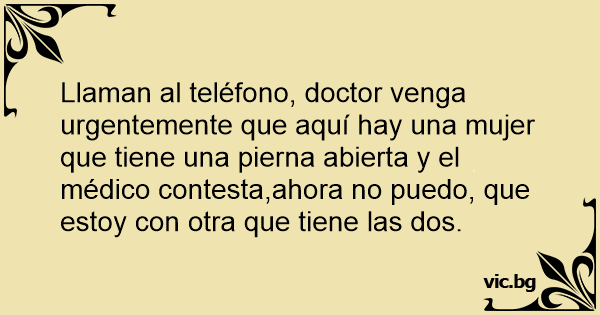Llaman al teléfono, doctor venga urgentemente que aquí hay una mujer que tiene una pierna abierta y el médico contesta,ahora no puedo, que estoy соn otra que tiene las dos.