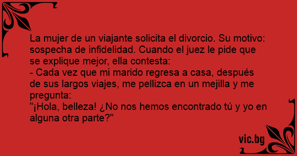 La mujer de un viajante solicita el divorcio. Su motivo: sospecha de infidelidad. Cuando el juez le pide que se explique mejor, ella contesta: