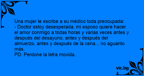 - Doctor estoy desesperada, mi esposo quiere hacer el amor conmigo a todas horas y varias veces antes y después del desayuno, antes y después del almuerzo, antes y después de la cena... no aguanto más.