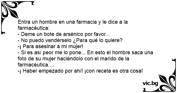 En una pequeña farmacia del pueblo entra una señora y dice: - Por favor, quiero comprar arsénico! - No puedo venderle eso. ¿Cuál es su finalidad? - ¡Matar a mi marido! - Mucho peor, para ese fin no...