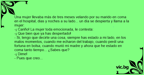 Um homem estava em coma algum tempo, sua esposa ficava a cabeceira dele dia e noite. Até que um dia o homem acorda, faz um sinal para a mulher, para se aproximar e sussurrar-lhe: