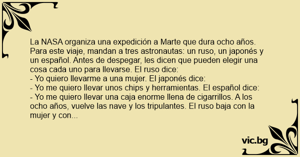 La NASA organiza una expedición a Marte que dura ocho años. Para este viaje, mandan a tres astronautas: un ruso, un japonés y un español. Antes de despegar, les dicen que pueden elegir una cosa cada uno para llevarse. El ruso dice: