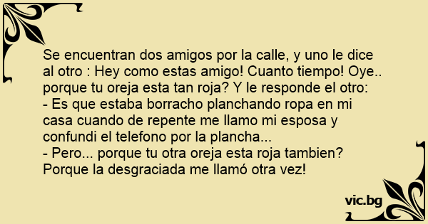 Había un tipo con las dos orejas quemadas y su amigo le pregunta: ¿Por qué tienes las dos orejas quemadas? El atlante le responde: Porque estaba planchando y llamaron por teléfono y contesté con la...