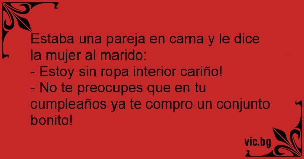 Sotul intra in pat Si-i sopteste sotiei la ureche: - Sunt Fara chiloti. Sotia , pe jumatate Adormita: - Lasa-ma sa dorm , maine am Sa-ti spal o pereche.