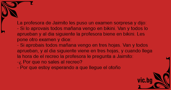 - Si lo aprovais todos mañana vengo en bikini. Van y todos lo aprueban y al dia siguiente la profesora biene en bikini. Les pone otro examen y dice: