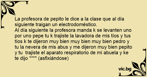 Al día siguiente la profesora manda k se levanten uno por uno pepe tu k trajiste la lavadora de mis tíos y tus tíos k te dijeron muy bien muy bien muy bien pedro y tu la nevera de mis abus y me dijeron muy bien pepito y tu trajiste el aparato respiratorio de mi abuela y ke te dijo **** (asfixiándose)