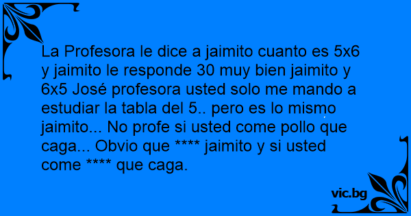 La Profesora le dice a jaimito cuanto es 5x6 y jaimito le responde 30 muy bien jaimito y 6x5 José profesora usted solo me mando a estudiar la tabla del 5.. pero es lo mismo jaimito... No profe si usted come pollo que caga... Obvio que **** jaimito y si usted come **** que caga.