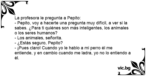 - Pepito, voy a hacerte una pregunta muy difícil, a ver si la sabes. ¿Para ti quiénes son más inteligentes, los animales o los seres humanos?