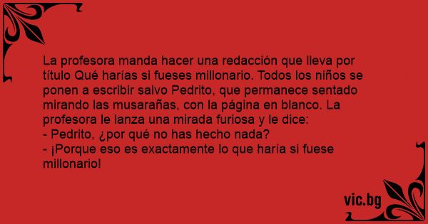 La profesora manda hacer una redacción que lleva por título Qué harías si fueses millonario. Todos los niños se ponen a escribir salvo Pedrito, que permanece sentado mirando las musarañas, соn la página en blanco. La profesora le lanza una mirada furiosa y le dice: