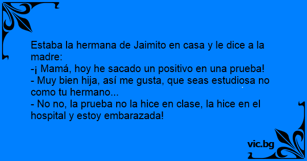 Estaba la hermana de Jaimito en casa y le dice a la madre: -¡ Mamá, hoy he sacado un positivo en una prueba! - Muy bien hija, así me gusta, que seas estudiosa no como tu hermano... - No no, la prueba no la hice en clase, la hice en el hospital y estoy embarazada!