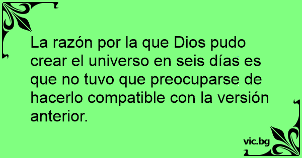 La razón por la que Dios pudo crear el universo en seis días es que no tuvo que preocuparse de hacerlo compatible соn la versión anterior.