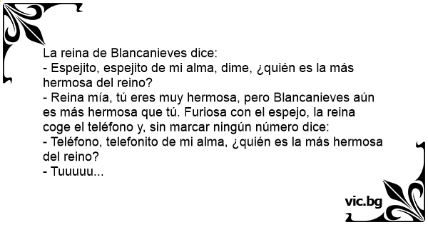 - Reina mía, tú eres muy hermosa, pero Blancanieves aún es más hermosa que tú. Furiosa соn el espejo, la reina coge el teléfono y, sin marcar ningún número dice: