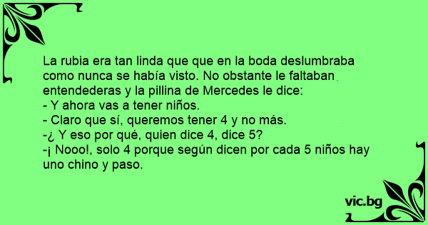 La rubia era tan linda que que en la boda deslumbraba como nunca se había visto. No obstante le faltaban entendederas y la pillina de Mercedes le dice: