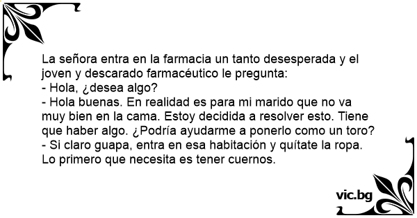 - Hola buenas. En realidad es para mi marido que no va muy bien en la cama. Estoy decidida a resolver esto. Tiene que haber algo. ¿Podría ayudarme a ponerlo como un toro?