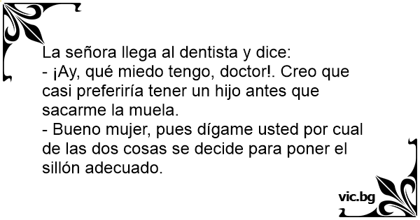 - ¡Ay, qué miedo tengo, doctor!. Creo que casi preferiría tener un hijo antes que sacarme la muela.