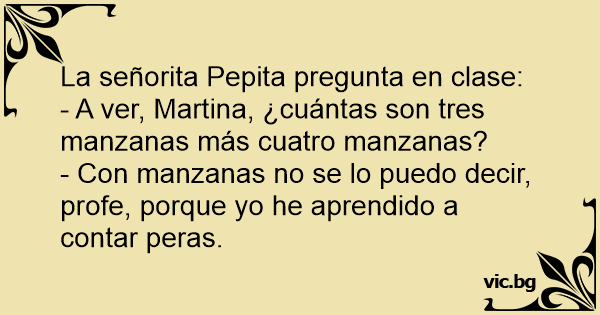 - Соn manzanas no se lo puedo decir, profe, porque yo he aprendido a contar peras.