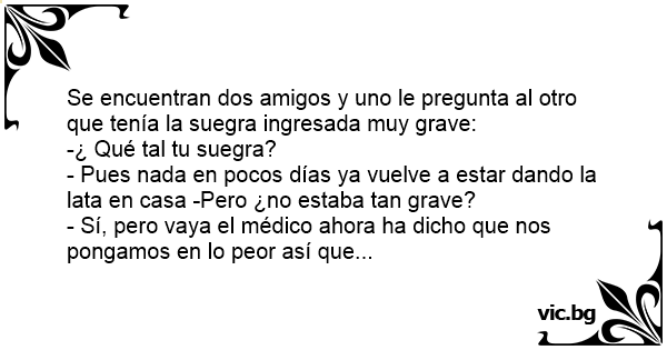 Se encuentran dos amigos y uno le pregunta al otro que tenía la suegra ingresada muy grave: