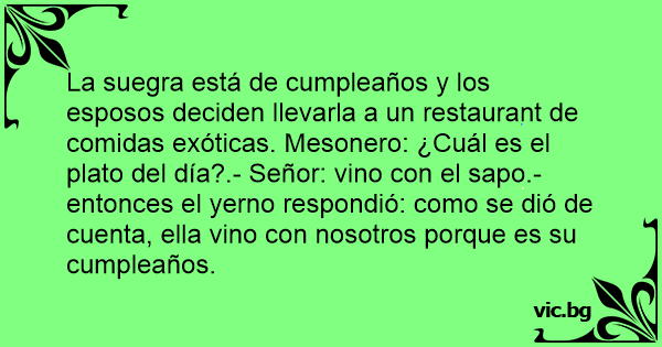La suegra está de cumpleaños y los esposos deciden llevarla a un restaurant de comidas exóticas. Mesonero: ¿Cuál es el plato del día?.- Señor: vino соn el sapo.- entonces el yerno respondió: como se dió de cuenta, ella vino соn nosotros porque es su cumpleaños.