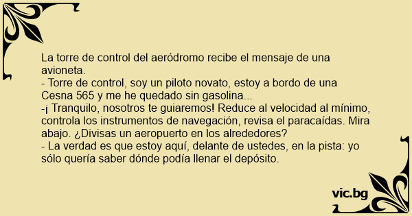 - Torre de control, soy un piloto novato, estoy a bordo de una Cesna 565 y me he quedado sin gasolina...