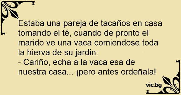 Estaba una pareja de tacaños en casa tomando el té, cuando de pronto el marido ve una vаса comiendose toda la hierva de su jardin: