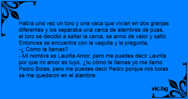 Este era una vaca y un torito que se querían profundamente pero, Vivian en granjas distintas y los separaba un alambre de puas, entonces un día el torito se armo de valor y salto y cuando ve a su amada le pregunta: - Linda vaquita ¿Cómo te llamas? La vaquita contesta- ROSA CORAZON, pero me...