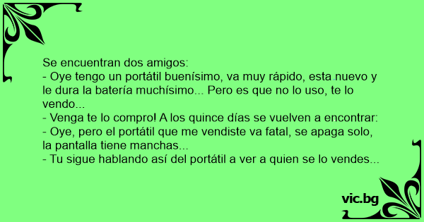 - Oye tengo un portátil buenísimo, va muy rápido, esta nuevo y le dura la batería muchísimo... Pero es que no lo uso, te lo vendo...