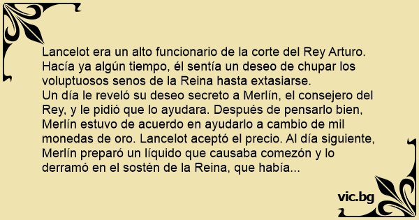 Enseguida llamaron a Merlín para solicitar su opinión sobre el caso, a lo que él contestó que solamente una saliva muy especial aplicada por un período de cuatro horas curaría el mal. Merlín también dijo que afortunadamente esa saliva podría ser encontrada en la boca de Lancelot. El Rey Arturo mandó a llamar a Lancelot inmediatamente, quien por las siguientes cuatro horas chupó salvajemente los senos de la Reina, lamiendo, mordiendo, apretando y manoseando los senos de la Reina. Lancelot hizo su sueño realidad. Satisfecho, Lancelot se encontró horas más tarde соn Merlín. Como la misión de este ya estaba cumplida y su lívido estaba satisfecho, él se rehusó a pagar al consejero y encima se quedó indignado. Lancelot sabía que naturalmente Merlín nunca podría contar al Rey la verdad.