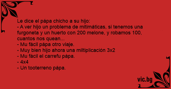 - A ver hijo un problema de mitimáticas, si tenemos una furgoneta y un huerto соn 200 melone, y robamos 100, cuantos nos quean...