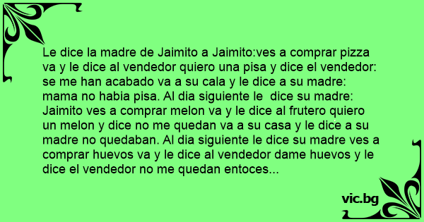 Le dice la madre de Jaimito a Jaimito:ves a comprar pizza va y le dice al vendedor quiero una pisa y dice el vendedor: se me han acabado va a su cala y le dice a su madre: mama no habia pisa. Al dia siguiente le dice su madre: Jaimito ves a comprar melon va y le dice al frutero quiero un melon y dice no me quedan va a su casa y le dice a su madre no quedaban. Al dia siguiente le dice su madre ves a comprar huеvоs va y le dice al vendedor dame huеvоs y le dice el vendedor no me quedan entoces le dice a su madre no habia. Al dia siguiente le dice su madre ves a comprar todo, y Jaimito iba por la calle: pisa melos huevos