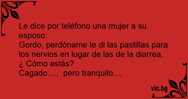 Le dice por teléfono una mujer a su esposo: Gordo, perdóname te di las pastillas para los nervios en lugar de las de la diarrea, ¿ Cómo estás? Cagado...., pero tranquilo....