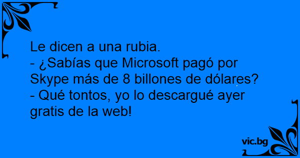 Δυο ξανθιές Συζητούν: - Ρε τα έμαθες; Η Microsoft αγόρασε το Skype για 8 δισ. δολάρια. - Καλά χαζοί είναι; Αφού μπορούν να το κατεβάσουν τζάμπα…!
