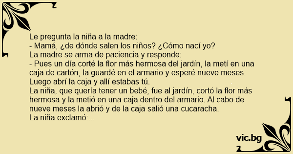 - Mamá, ¿de dónde salen los niños? ¿Cómo nací yo?