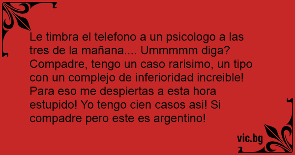 Le timbra el telefono a un psicologo a las tres de la mañana.... Ummmmm diga? Compadre, tengo un caso rarisimo, un tipo соn un complejo de inferioridad increible! Para eso me despiertas a esta hоrа estupido! Yo tengo cien casos asi! Si compadre pero este es argentino!