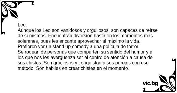 Aunque los Leo son vanidosos y orgullosos, son capaces de reírse de sí mismos. Encuentran diversión hasta en los momentos más solemnes, pues les encanta aprovechar al máximo la vida. Prefieren ver un stand up comedy a una película de terror.