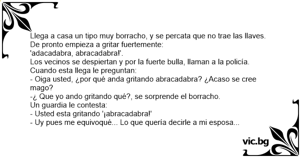 Llega a casa un tipo muy borracho, y se percata que no trae las llaves. De pronto empieza a gritar fuertemente: