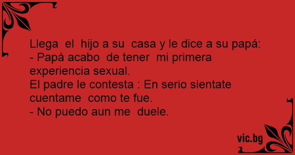 Синот прв пат имал секс Chiste de la virginidad -Татко днес правих секс. Иванчо се прибира вкъщи и казва на баща си: C'est un petit garçon qui va voir son père, tout fier : Papa hoy hise el amor por primera vez: - "Μπαμπά, μόλις χθες είχα την πρώτη μου σεξουαλική επαφή", λέει ο Τοτός στον πατέρα του. In the morning Little Johnny says to his father, "Daddy last night I had my first sexual encounter." His father looks at him proudly and says, "When are you planning to do it again?" "I don't know daddy ever since it happened my ass has been hurting like crazy." Der 15 jährige Bub kommt freudestrahlend nach Hause und sagt: "Papa, heute hab ich meinen ersten Geschlechtsverkehr gehabt!" Der Vater sagt: "Komm setzn wir uns auf die Chouch, das mußt du mir erzählen. Darauf sagt der Bub:" Sitzen geht nit so gut!" Kommt Fritzchen zwei Stunden zu spät nach Hause. Der Vater sitzt wartend im Wohnzimmer. Sagt der Sohn: "Sorry Paps, dass ich zu spät komme, aber ich hatte eben das erste Mal Sex." Darauf der Vater:" Prima mein Junge. Setz Dich zu mir und lass uns ein Glas Cognac trinken!" Sohn: "Den Cognac trink... Der 18-jährige Sohn kommt mitten in der Woche um 4 Uhr morgens nachHause. Der Vater hat gewartet und sagt mürrisch: "Wo warst du so lange, ich hab mir Sorgen um Dich gemacht!" Sohn antwortet: "Ich hab heute das erste Mal ganz tierisch Sex gehabt." Der Vater: "Toll, mein Sohn. Setzt Dich zu mir,... En pojke kommer hem sent en kväll klockan 10. Hans far blir förbannad då han egentligen skulle vara hemma senast 7 och ber sonen förklara sig. Sonen säger då tyst... - Far, jag har haft min sex-debut. Då smalt fadern och sa med sin mjuka stämma: - Det är OK, kom hem när du vill och om det är... - Papa, j'ai perdu ma virginité ! - Bravo je suis fier de toi fiston ! - Merci papa ! - Assieds-toi on va fêter ça. - Je peux pas m'asseoir. O filho chega e diz todo orgulhoso pro pai: — Pai, hoje eu tive a minha primeira experiência sexual! E o pai: — Que legal filho!! Senta aí pra me contar. — Ah, pai, é que não tá dando pra sentar... Kommt ein Sohnemann ganz aufgeregt zurück nach Hause und sagt: „Papa, Papa, heute ist es tatsächlich passiert!“ Da erwidert der Vater: „Was ist denn passiert?“ „Na, ich hatte soeben das erste Mal... Jantje komt ontzettend wild en opgewonden thuis en roept: "Mama, mama, ik ben geen maagd meer." "Nou," zegt moeder, "dat is toch iets heel speciaals, ga het maar snel aan je vader vertellen. Hij... Приходит сын вечером домой и говорит отцу: - Пап, я сегодня получил свой первый сексуальный опыт. - Как здорово, сынок! Садись рассказывай. - Не, ты знаешь, я лучше постою. C’est l’histoire d’un jeune homme qui rentre chez lui après une grosse soirée. Celui-ci, très enthousiaste, dit à son père : - Papa ! J’ai une grande nouvelle à t’annoncer ! J’ai eu ma première... Intr-o zi vine Bula de la scoala si ii zice tatalui sau: - Tata , tata , am avut prima mea experienta sexuala. - Da! Atunci stai jos si povesteste-mi! - Aaa, pai da' nu pot tata ca ma doare fundul. C'est Thierry qui rentre à 4h du mat' tout doucement et se fait surprendre par son Père: - Nom de dieu Thierry, tu as vu l'heure qu'il est !!! - Oui je sais Papa, mais euh... j'ai eu ma première... Intr-o zi vine Bula acasa fericit foc. Taicasu' curios il intreaba care-i motivu'. - Tata, astazi am avut prima experienta sexuala. Zice Bula cu zambetul pe buze. - Serios? Ia sezi si spune-mi cum... Den 16 åriga killen kom hem och sa: - Pappa, jag har just haft min sexdebut! - Åh fan, sätt dig ner och berätta! - Nej, jag kan inte sitta.. Far, jeg har fået sex for første gang i nat Sønnen til faderen: "Far, jeg har fået sex for første gang i nat". "Tillykke min søn", siger faderen, og går ud og knapper 2 øl op. "Nå min søn, har du... - Tēt!!! Man šodien bija pirmā seksuālā pieredze. - Apsveicu, dēls, sēdies un pastāsti... - Paldies es labāk pastāvēšu!!!