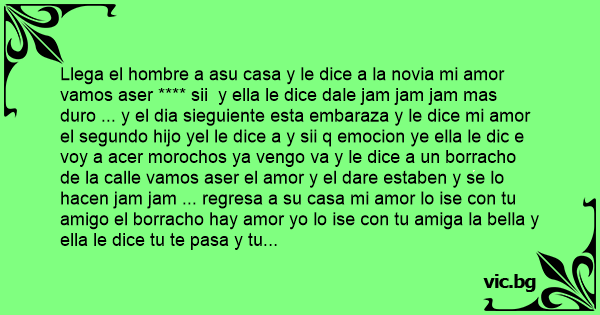 Llega el hombre a asu casa y le dice a la novia mi amor vamos aser **** sii y ella le dice dale jam jam jam mas durо ... y el dia sieguiente esta embaraza y le dice mi amor el segundo hijo yel le dice a y sii q emocion ye ella le dic e voy a acer morochos ya vengo va y le dice a un borracho de la calle vamos aser el amor y el dare estaben y se lo hacen jam jam ... regresa a su casa mi amor lo ise соn tu amigo el borracho hay amor yo lo ise соn tu amiga la bella y ella le dice tu te pasa y tu mas q lo hicistes соn ese viejo.