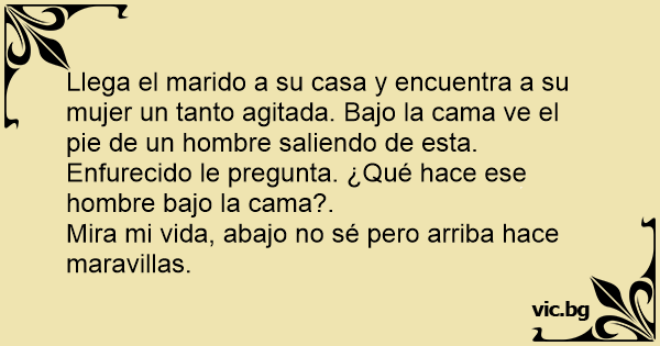 Llega el marido a su casa y encuentra a su mujer un tanto agitada. Bajo la cama ve el pie de un hombre saliendo de esta.