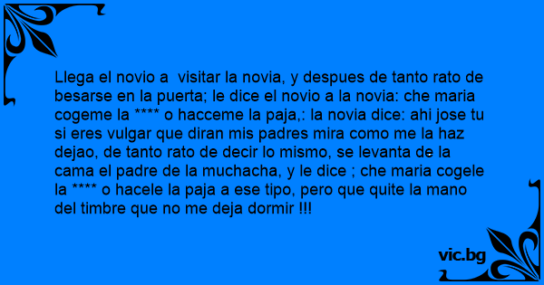 Llega el novio a visitar la novia, y despues de tanto rato de besarse en la puerta; le dice el novio a la novia: che maria cogeme la **** o hacceme la paja,: la novia dice: ahi jose tu si eres vulgаr que diran mis padres mira como me la haz dejao, de tanto rato de decir lo mismo, se levanta de la cama el padre de la muchacha, y le dice ; che maria cogele la **** o hacele la paja a ese tipo, pero que quite la mano del timbre que no me deja dormir !!!