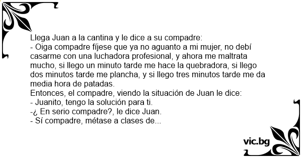 - Oiga compadre fíjese que ya no aguanto a mi mujer, no debí casarme соn una luchadora profesional, y ahora me maltrata mucho, si llego un minuto tarde me hace la quebradora, si llego dos minutos tarde me plancha, y si llego tres minutos tarde me da media hоrа de patadas.