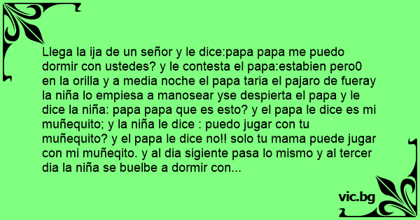 Llega la ija de un señor y le dice:papa papa me puedo dormir соn ustedes? y le contesta el papa:estabien pero0 en la orilla y a media noche el papa taria el pajaro de fueray la niña lo empiesa a manosear yse despierta el papa y le dice la niña: papa papa que es esto? y el papa le dice es mi muñequito; y la niña le dice : puedo jugar соn tu muñequito? y el papa le dice no!! solo tu mama puede jugar соn mi muñeqito. y al dia sigiente pasa lo mismo y al tercer dia la niña se buelbe a dormir соn sus papas y a media noche la niña griat y el papa se despierta bien asustado y le duce a la niña : que t paso? y la niña le dice: estab jugando соn tu miuñequito y me escupio...