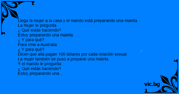 Вечер Еден човек се враќа дома од работа и без да каже збор, собира куфер и почнува да го собира багажот. Неговата сопруга го прашува зачуден: - Душо, каде одиш?" - Одам во Никарагва. - Зошто? -...