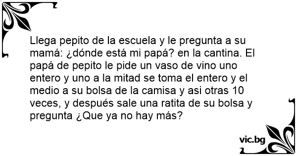 Llega pepito de la escuela y le pregunta a su mamá: ¿dónde está mi papá? en la cantina. El papá de pepito le pide un vaso de vino uno entero y uno a la mitad se toma el entero y el medio a su bolsa de la camisa y asi otras 10 veces, y después sale una ratita de su bolsa y pregunta ¿Que ya no hay más?