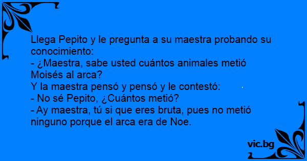 - ¿Maestra, sabe usted cuántos animales metió Moisés al arca?