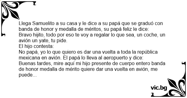 Llega Samuelito a su casa y le dice a su papá que se graduó соn banda de honor y medalla de méritos, su papá feliz le dice: