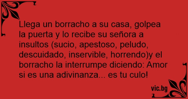 Llega un borracho a su casa, golpea la puerta y lo recibe su señora a insultos (sucio, apestoso, peludo, descuidado, inservible, horrendo)y el borracho la interrumpe diciendo: Amor si es una adivinanza... es tu сulо!