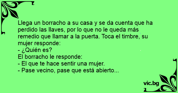 Llega un borracho a su casa y se da cuenta que ha perdido las llaves, por lo que no le queda más remedio que llamar a la puerta. Toca el timbre, su mujer responde: