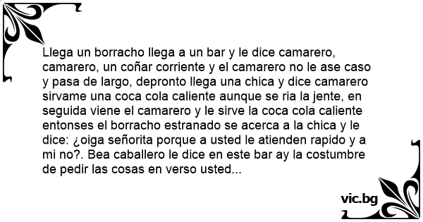 Llega un borracho llega a un bar y le dice camarero, camarero, un coñar corriente y el camarero no le ase caso y pasa de largo, depronto llega una chica y dice camarero sirvame una coca cola caliente aunque se ria la jente, en seguida viene el camarero y le sirve la coca cola caliente entonses el borracho estranado se acerca a la chica y le dice: ¿oiga señorita porque a usted le atienden rapido y a mi no?. Bea caballero le dice en este bar ay la costumbre de pedir las cosas en verso usted pida en verso y en seguida le atiende. A ya entoce y dice camarero,sirbame un vino san romero y que le den por el сulо al camerero y el camarero sin molestarse viene y le dice,¡caballero solo tenemos coñar corriente y que le den por el сulо al cliente!y por ay estaba un маriquiта escuchando el extraño pedido se aserca y dice: camarero mejor que nos traigan un vino 103 y que nos den por el сulо a los tres...