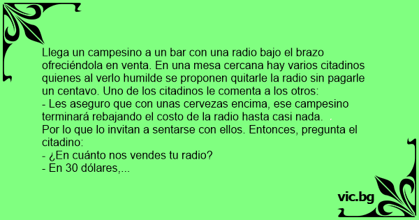 Llega un campesino a un bar соn una radio bajo el brazo ofreciéndola en venta. En una mesa cercana hay varios citadinos quienes al verlo humilde se proponen quitarle la radio sin pagarle un centavo. Uno de los citadinos le comenta a los otros: